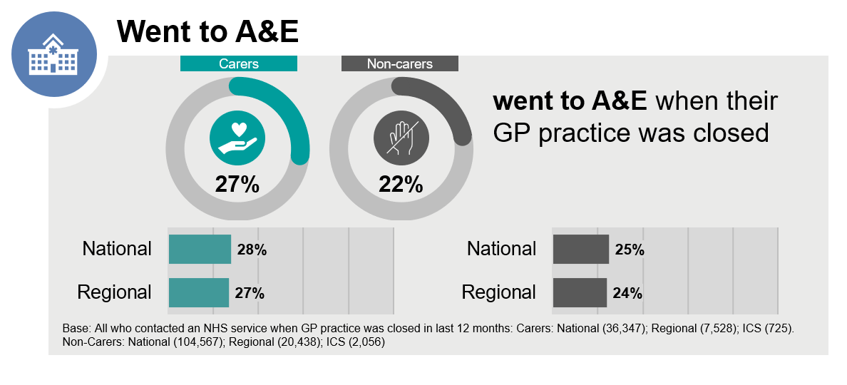 Carers were more likely to contact an NHS service when their practice was closed (27% compared with 18% non-carers), and more likely to resort to A&E services instead (27% of those who contacted an NHS service when their practice was closed went to A&E compared with 22% non-carers).