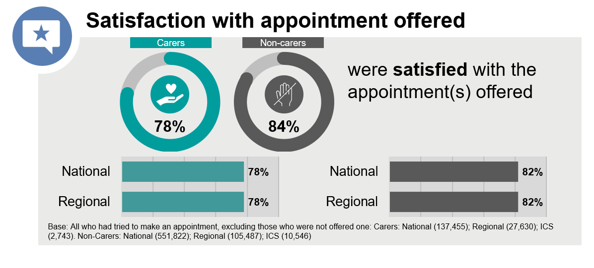 Carers were less satisfied with the appointment they were offered (78% satisfied compared with 84% non-carers). Looking into potential reasons for this, carers were more likely not to take the appointment they were offered because they couldn’t see their preferred GP, the type of appointment they wanted was not available and because they couldn’t book ahead.