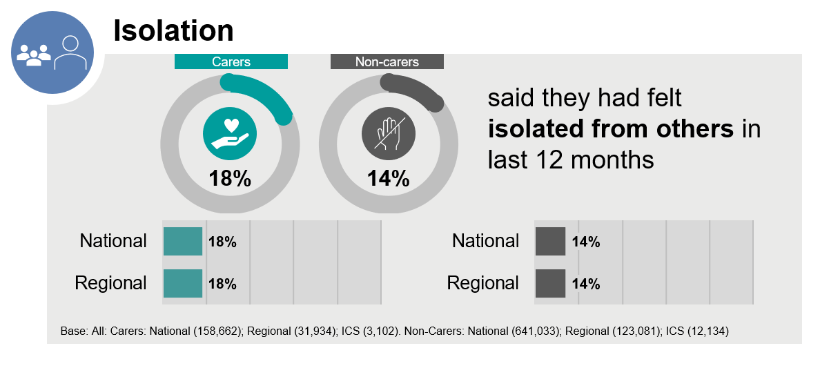 Carers were more likely to have felt isolated from others in the last 12 months (18% compared with 14% non-carers).