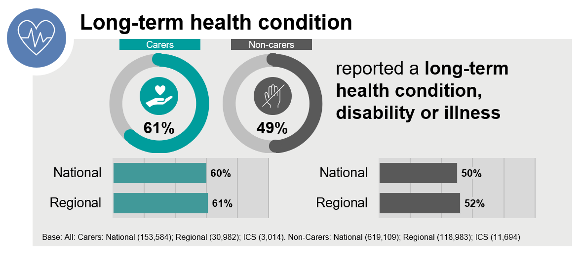Carers were also more likely to say they had a long-term condition, disability or illness (61% compared with 49% non-carers). In terms of specific conditions, carers were more likely to report a long-term mental health condition (14% compared with nine per cent), and arthritis or an ongoing problem with their back or joints (22% compared with 15%).