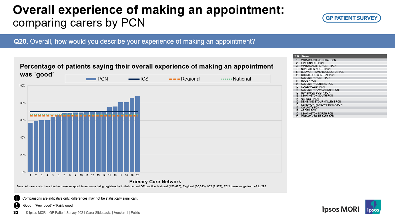 To provide insight about the experiences of carers for each Integrated Care System (ICS), including breakdowns by Primary Care Network (PCN), the Commitment to Carers team has recently commissioned Ipsos to produce ICS slidepacks.