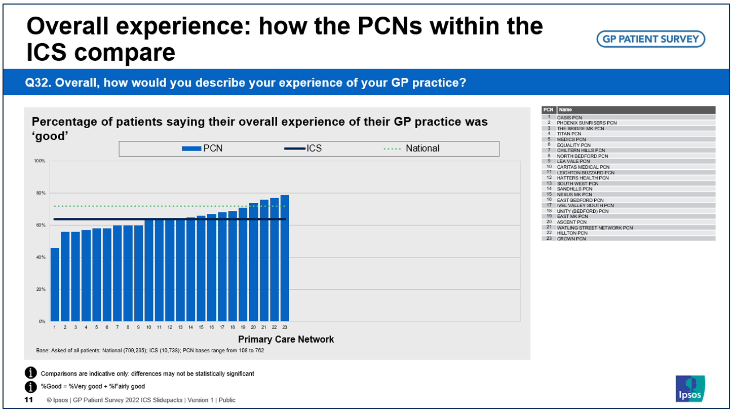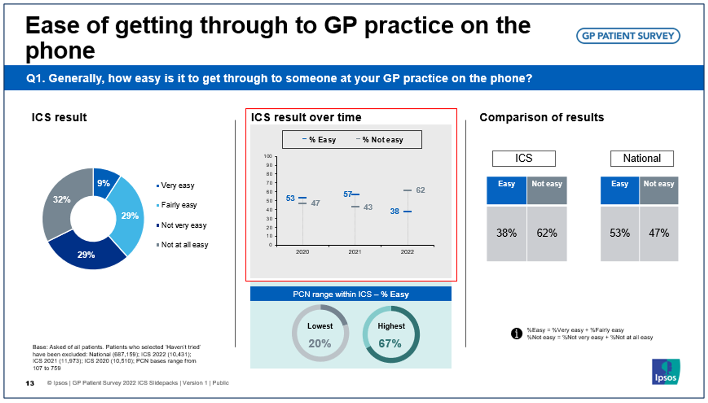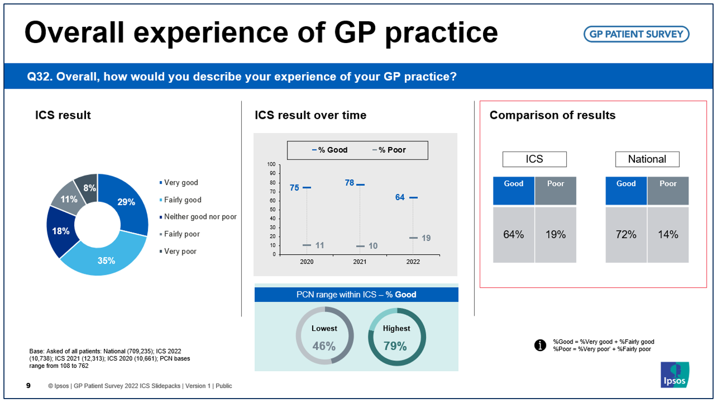 The 2022 GP Patient Survey (GPPS) results have now been published. This year, we have created individual Integrated Care System (ICS) slide packs which are available on our website. The slide packs present data for key questions from the 2022 GPPS for each ICS and provide valuable and useful insights by including trend data, PCN (primary care network) comparisons and benchmarking.