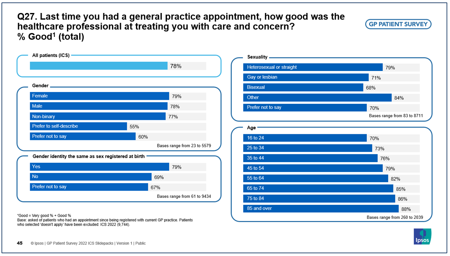 GPPS data can also be used to compare experiences among different patient groups, providing important insights into health inequalities. This year, a breakdown of the results by a selection of key demographic variables has been included in the ICS slide packs for one question (Last time you had a general practice appointment, how good was the healthcare professional at treating you with care and concern?). The key demographic variables include: gender, gender identity, sexuality, age, Indices of Multiple Deprivation (IMD) quintiles, disability status, long-term conditions, religion, ethnicity, and carer status.