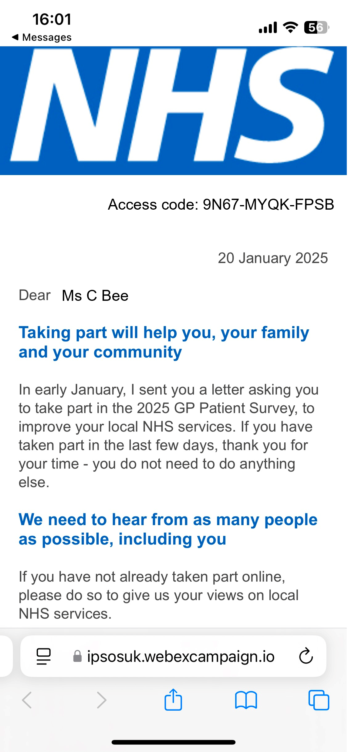 Additionally, text messages are sent to invite patients to take part in the survey, where mobile numbers are available. Text messages will contain a unique link which allows you to take part online without needing to enter your access code. Some text messages will include a link to an invitation e-letter which explains how to take part in the survey.