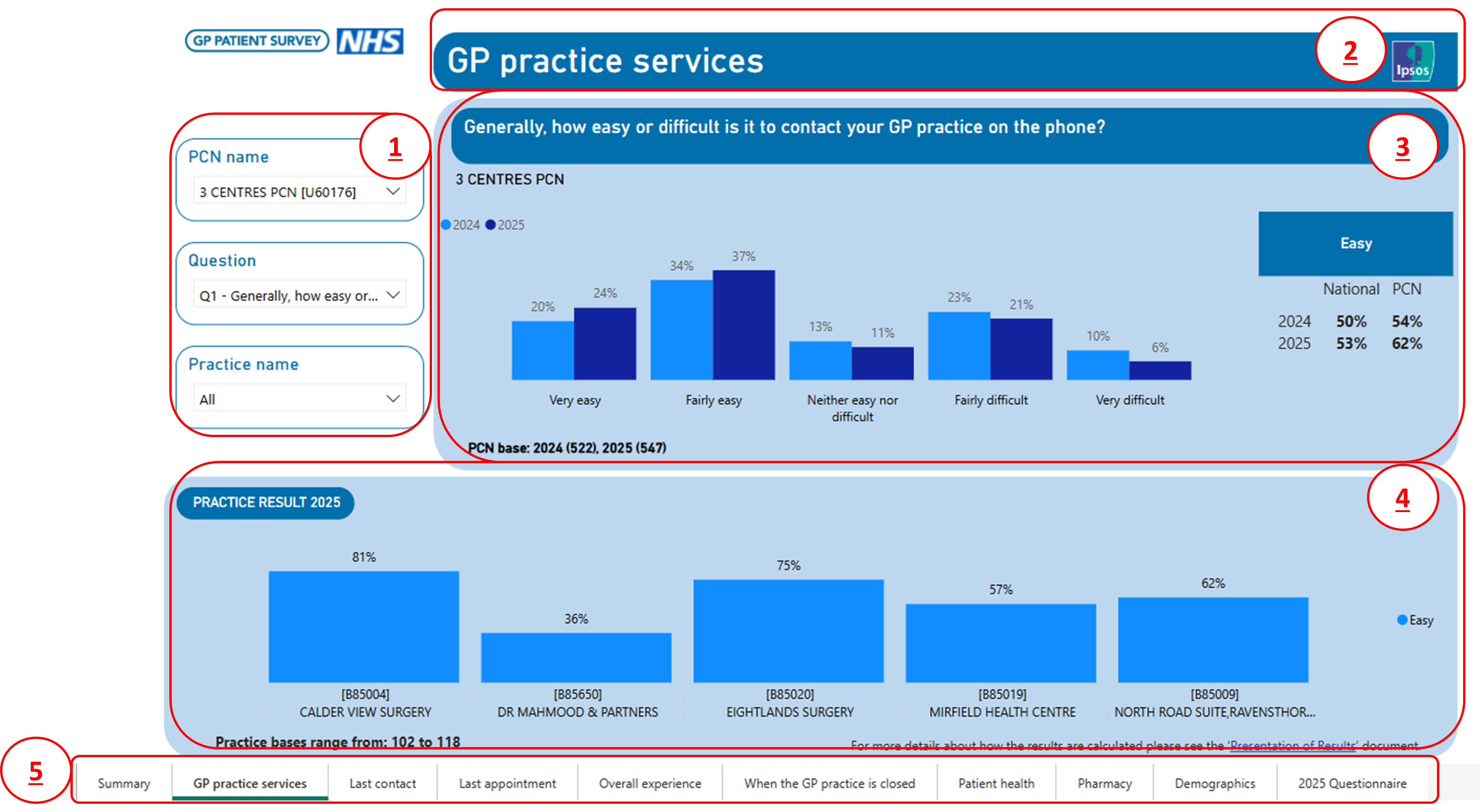 Question results – question results for the selected PCN are shown in this area for 2025 where available, with bases displayed beneath the charts.