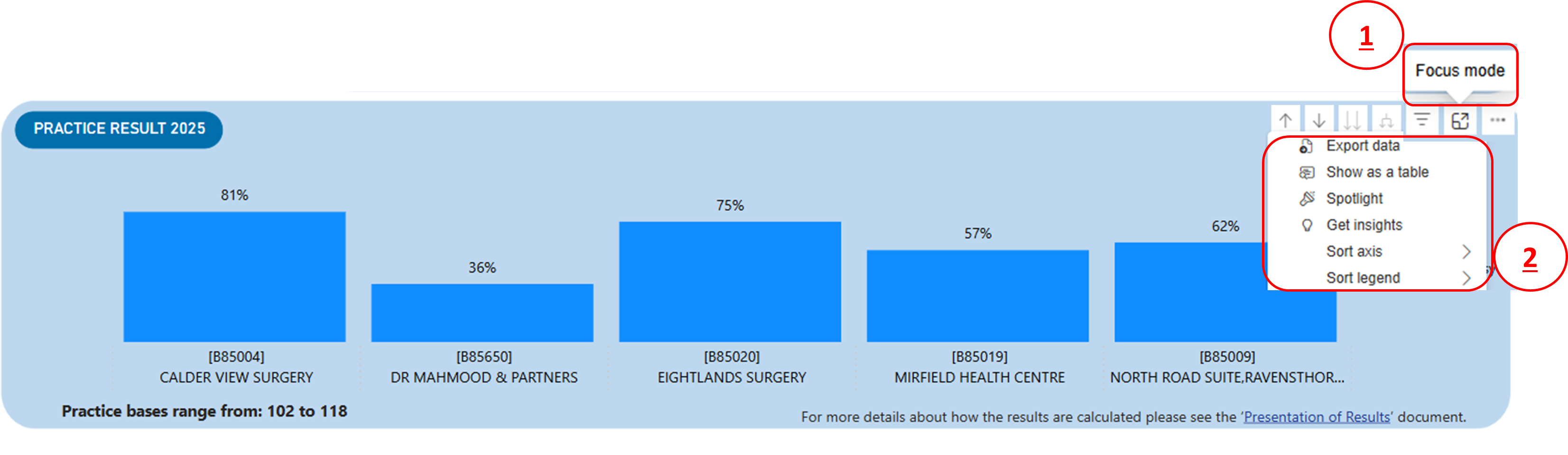 2. Viewing the tool bar – hovering over either the PCN or practice charts will reveal a tool bar at the top right of the charts that can be used to change the display options.